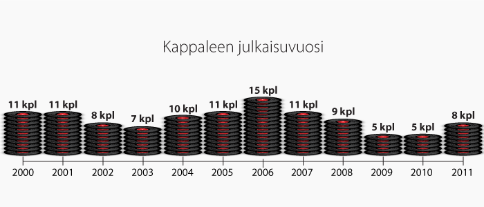 Pahnanpohjimmaisiksi jäivät vuodet 2009 ja 2010 viidellä kappaleella (4,5 %) kumpikin. Tuoreehkoja kappaleita päätyi silti listalle kohtalaisen paljon, sillä vuosi 2011 on edustettuna kahdeksalla kappaleella (7,2 %).