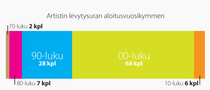 Mukaan mahtui kappaleita viidellä eri vuosikymmenellä levytysuransa aloittaneilta artisteilta. Ylivoimaisesti eniten listalle päätyi 2000-luvun ensimmäisellä vuosikymmenellä aloittaneita esittäjiä, jopa 68 (61,3 %)! 1990-luku seurasi perässä 28 esittäjällä (25,2 %), 1980-luku seitsemällä (6,3 %) ja tämä vuosikymmen kuudella (5,4 %).