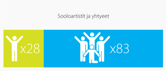 Listan esittäjistä 28 eli melko tarkalleen neljäsosa (25,2 %) on sooloartisteja ja kolme neljäsosaa (74,8 %) yhtyeitä. Yksiselitteistä eroa näiden välille ei ollut kaikissa tapauksissa mahdollista tehdä.