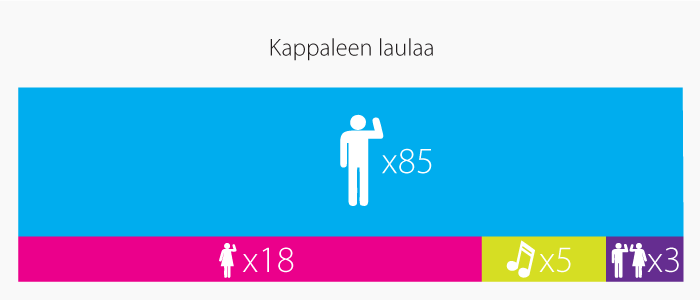 Siitä huolimatta, että naisäänet ovat nousseet suomalaisessa popmusiikissa vahvasti pinnalle 2000-luvulla, naisten laulamia kappaleita mukaan mahtui vain 18 eli 16,2 %. Miehet jyräsivät 85 kappaleella (76,6 %). Kappaleita, joissa mies- ja naisäänet esiintyvät tasavertaisina, listalla on kolme (2,7 %) ja instrumentaaleita viisi (4,5 %).