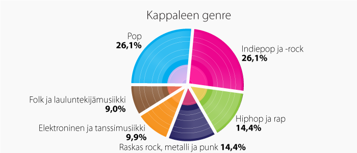 Jaoimme listalle päätyneet kappaleet myös karkeasti kuuteen genreen. Selvään pop-kategoriaan tippui 29 kappaletta (26,1 %), samoin indiepopin ja -rockin sateenvarjon alle.
