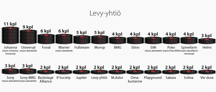 Levy-yhtiöistä eniten listan kappaleista, yksitoista eli 9,9 %, on julkaissut Johanna. Mukaan on laskettu myös kappaleet, jotka yhtiö on julkaissut Universalin ostettua sen.