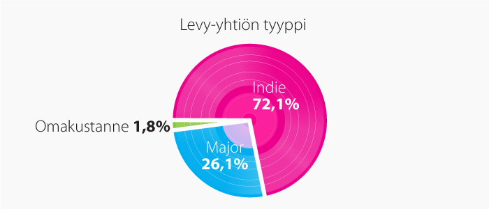 Valtaosa listan kappaleista on julkaistu indie-levymerkillä, peräti 72,1 prosenttia (80 kappaletta). Monikansalliset levy-yhtiöjätit EMI, Warner, Universal, BMG, Sony ja kahden jälkimmäisen yhteenliittymä ovat julkaisseet 26,1 prosenttia kappalehelmistä (29 kappaletta). Mukaan on laskettu myös näiden lukuisat alamerkit ja lisensoinnit.