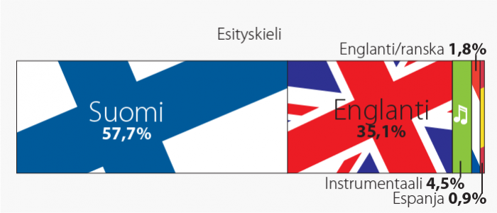 Esityskielenä suomi on ylivoimaisesti suosituin listallamme. Kappaleista 64 (57,7 %) on laulettu ensimmäisellä kotimaisella. Tavalla tai toisella englannin kielellä esitettyjä kappaleita mukana on 39 (35,1 %). Yhtään ruotsiksi laulettua kappaletta listalle ei noussut.